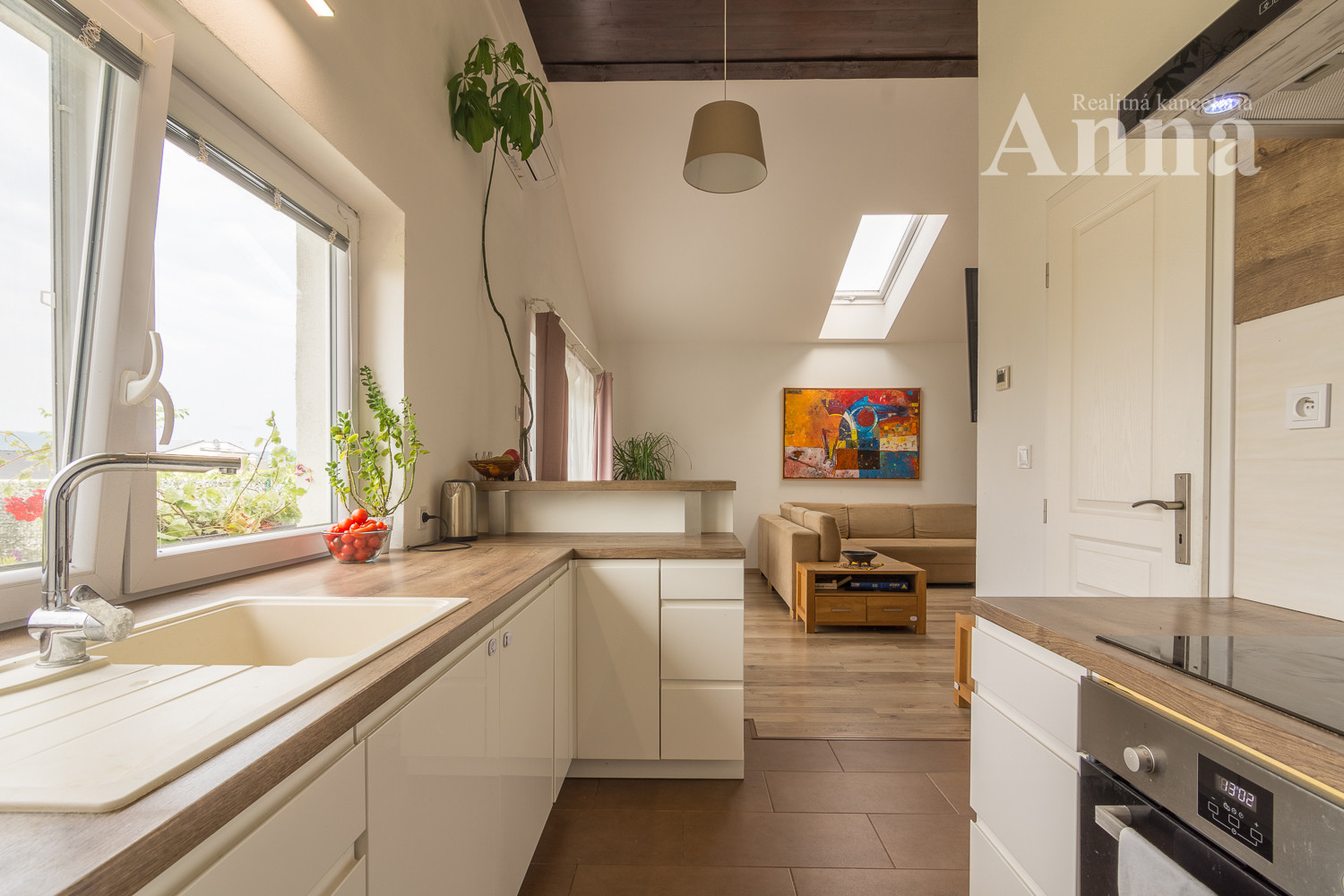 - Priestranná obývačka s kuchyňou s vysokým priznaným stropom, ktorá vytvára vzdušný a svetlý priestor