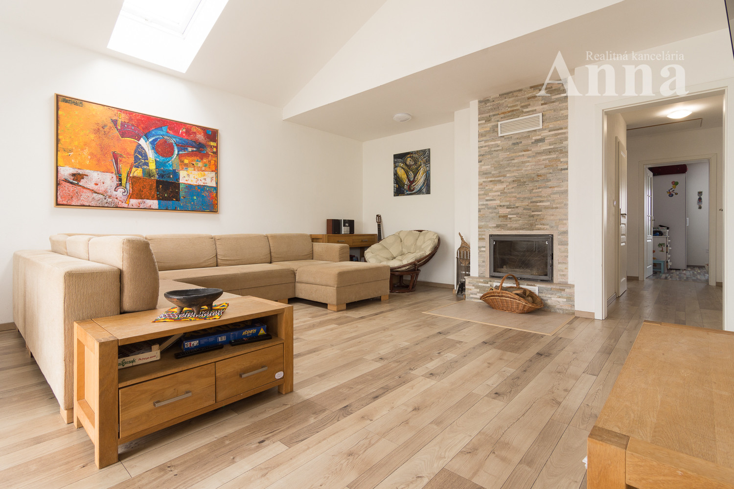 - Priestranná obývačka s kuchyňou s vysokým priznaným stropom, ktorá vytvára vzdušný a svetlý priestor