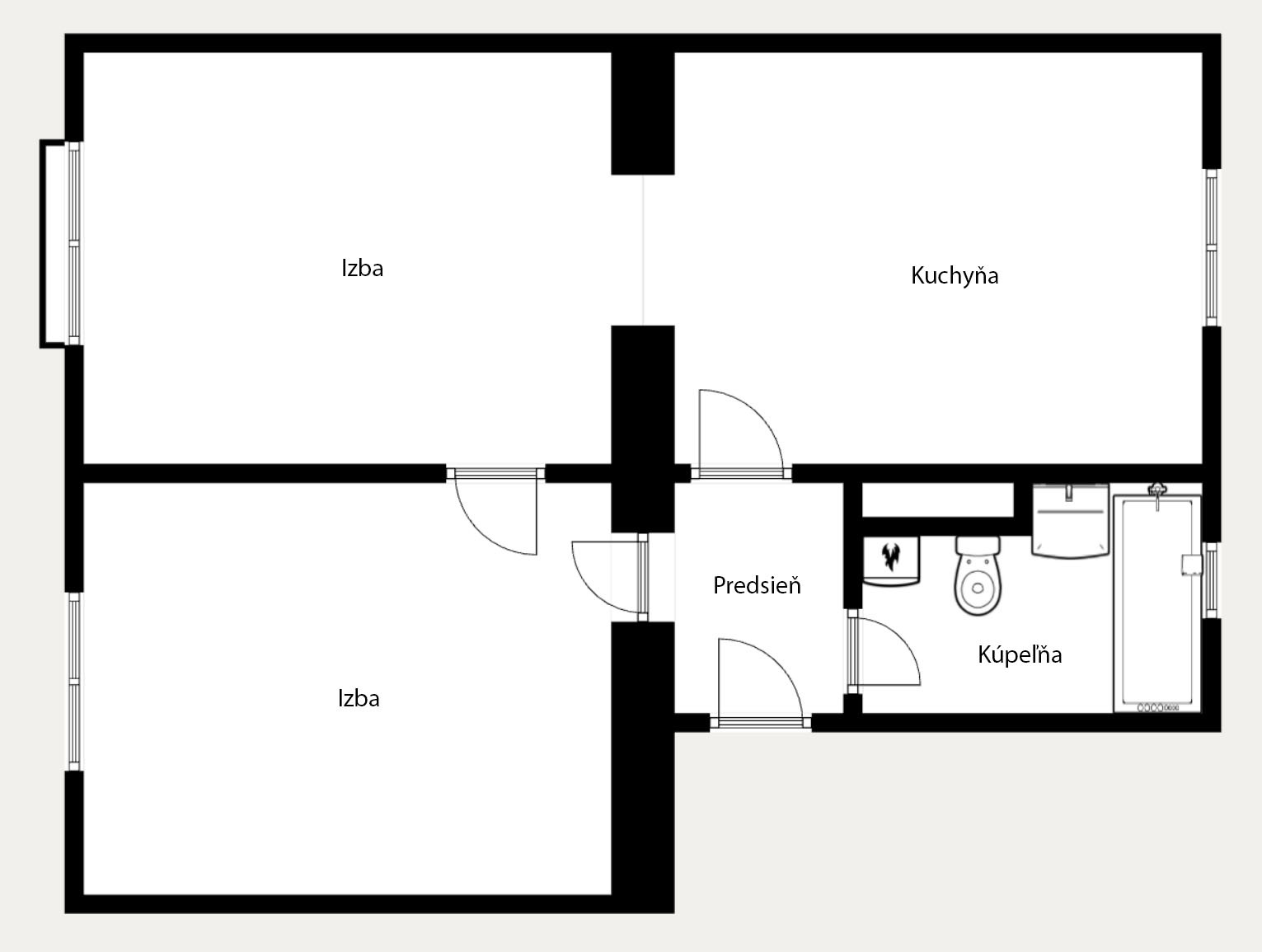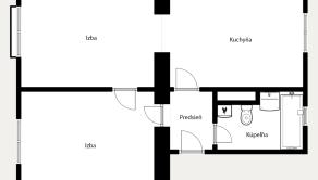 Dispozícia a popis: Byt pozostáva z 2 izieb, kuchyne, kúpeľne (WC, umývadlo, práčka, vaňa), predsiene a pivnice. Celková výmera je 55 m2 (z toho pivnica cca 7 m2). Nachádza sa na zvýšenom prízemí vo 4. poschodovom dome, je orientovaný na 2 strany S - J.
