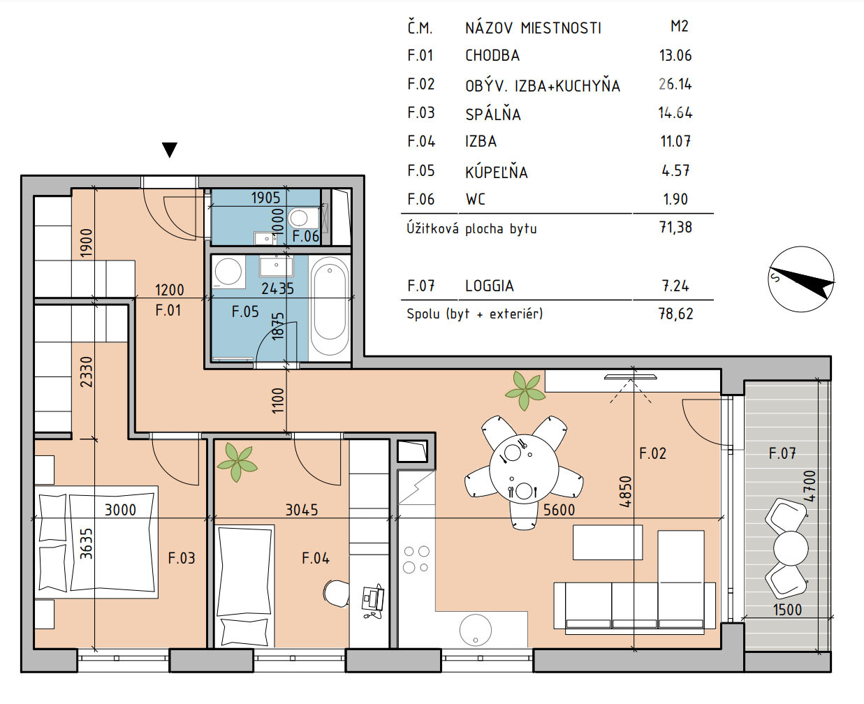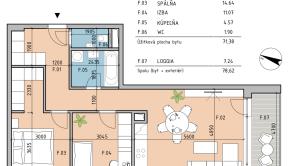 Dispozícia a popis: Byt pozostáva z obývačky s kuchynským kútom, 2 samostatných izieb, kúpeľne (vaňa, práčka, umývadlo), WC (s umývadlom), šatníka, predsiene, loggie a skladu. Celková výmera je 71,4 m2 + 7,2 m2 loggia + 3,2 m2 sklad. Nachádza sa na 1.,poschodí z 5. Je orientovaný na juh a západ.