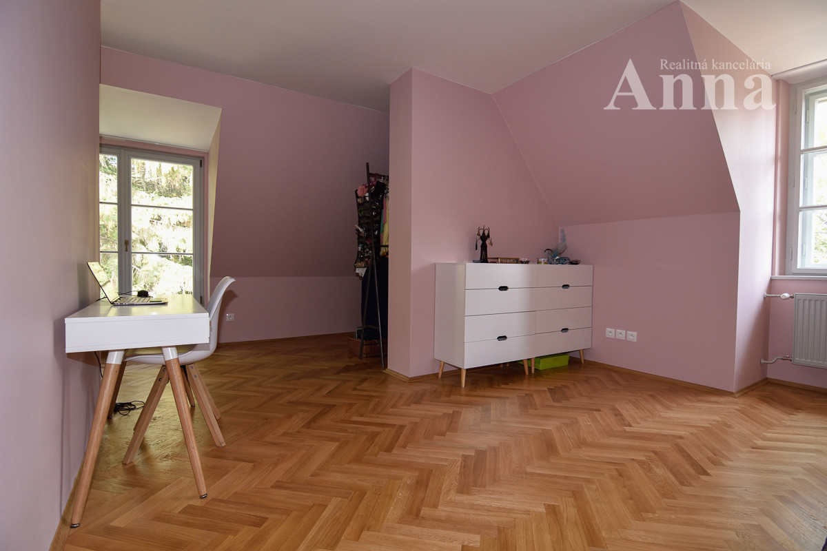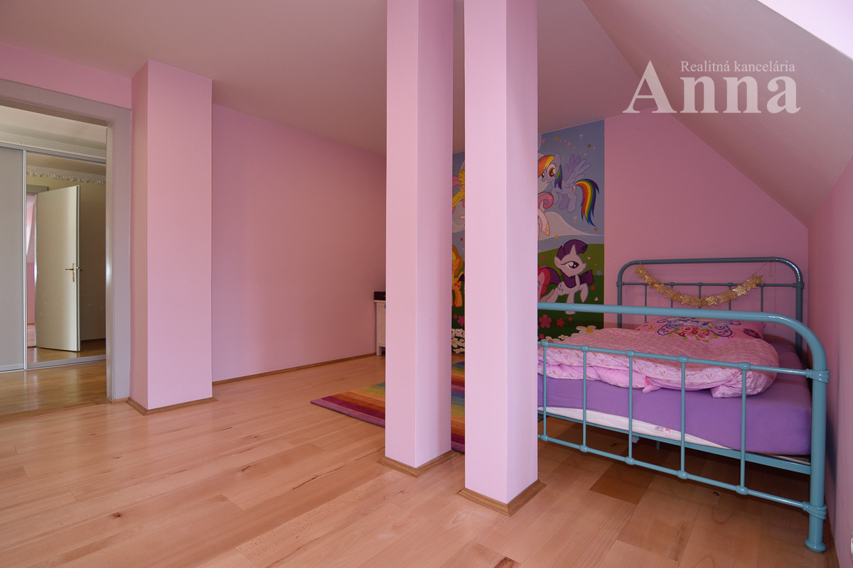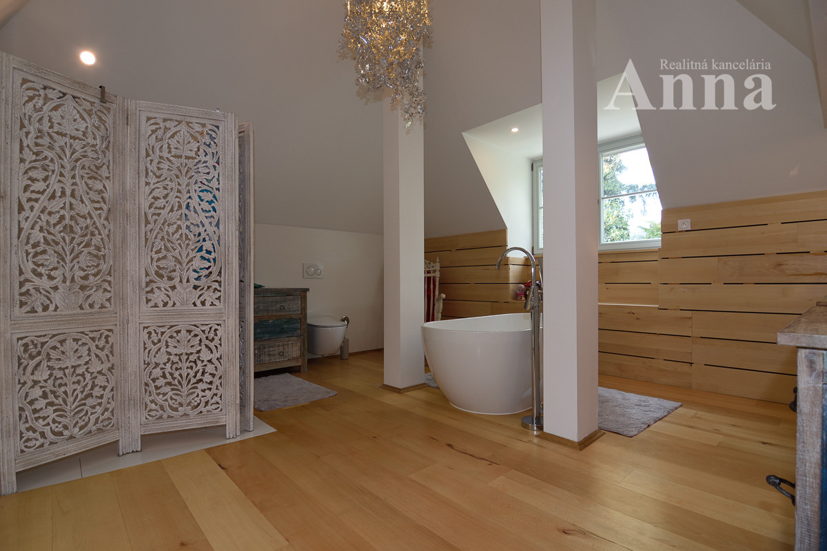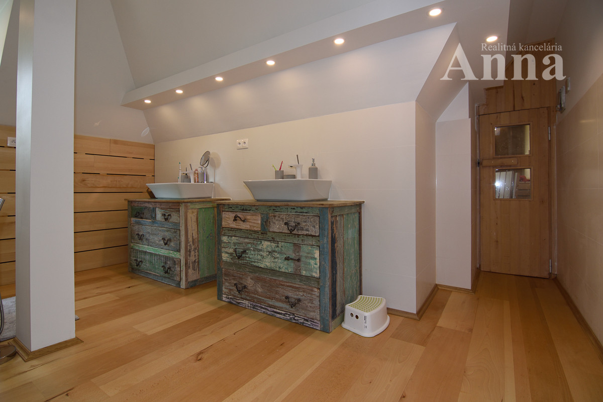 Poschodie - 3x samostatná izba, šatník, veľká kúpeľňa (voľne stojaca vaňa, 2x umývadlo, WC, sprchovací kút), chodba a sauna.