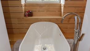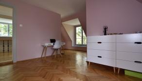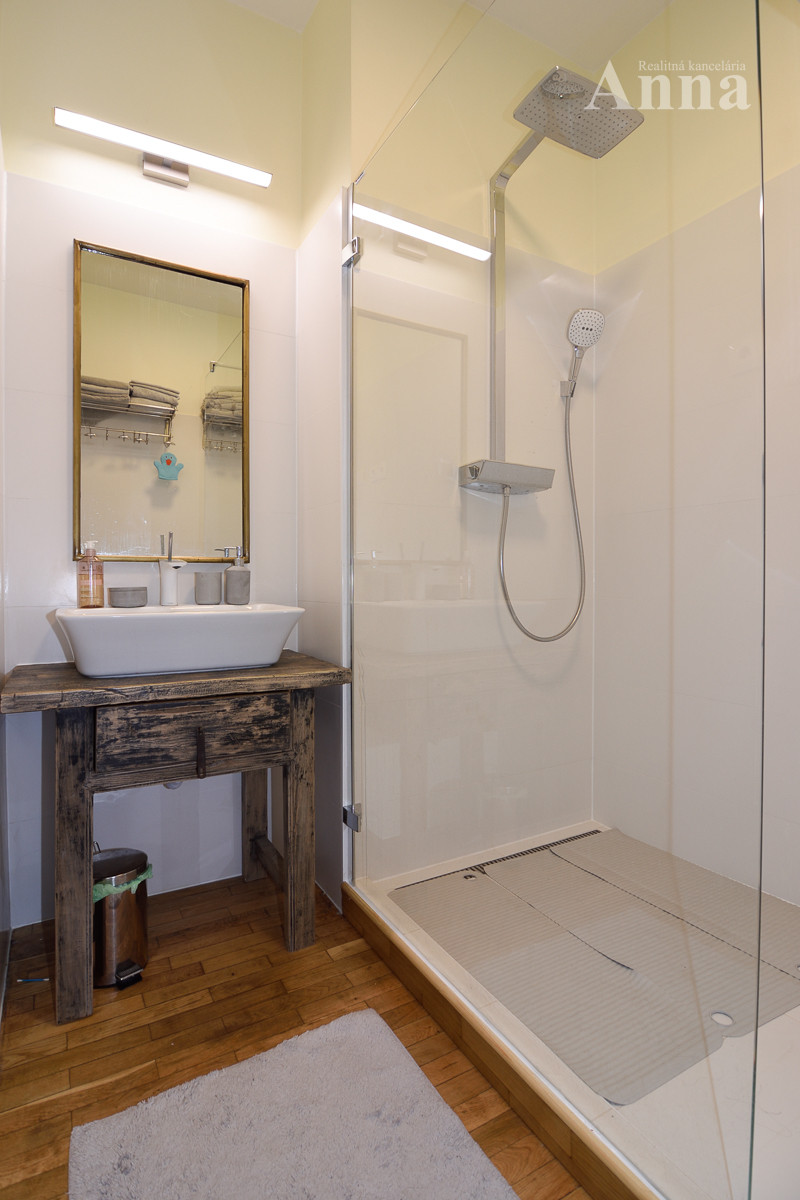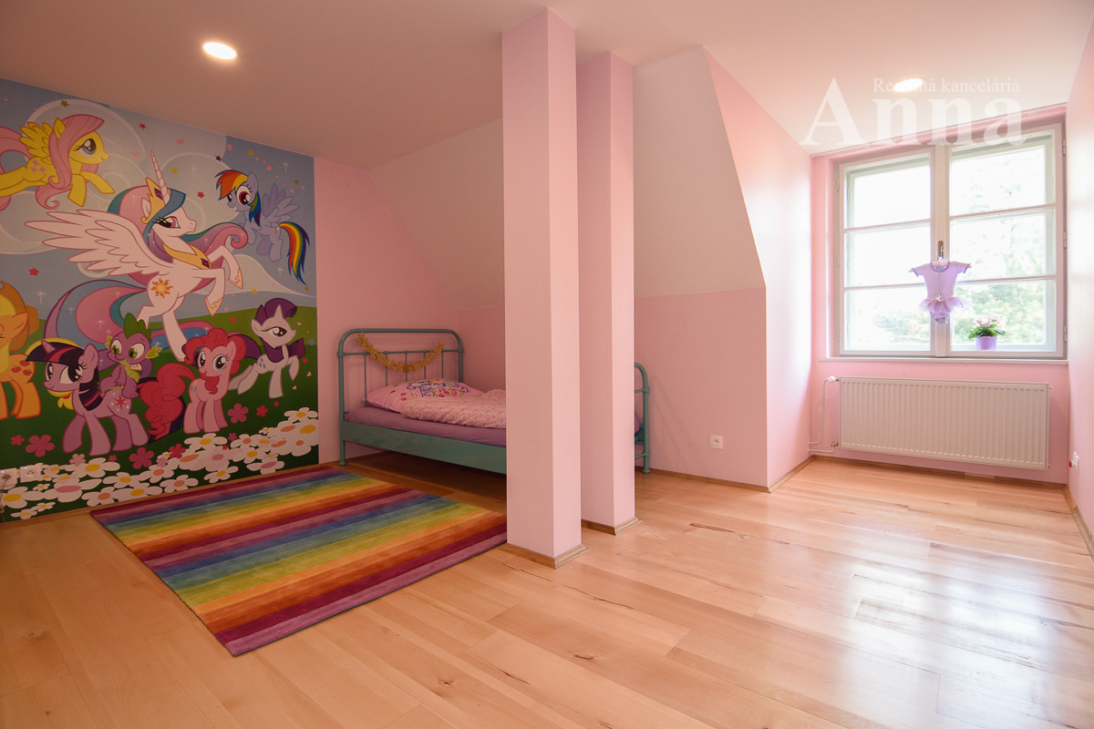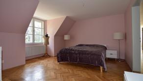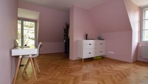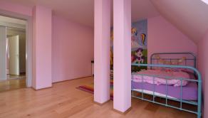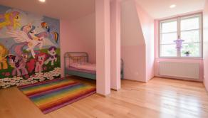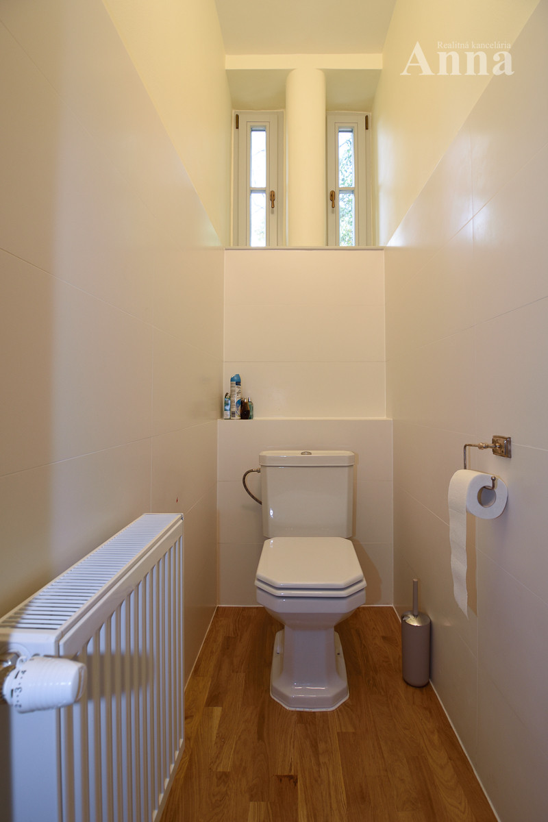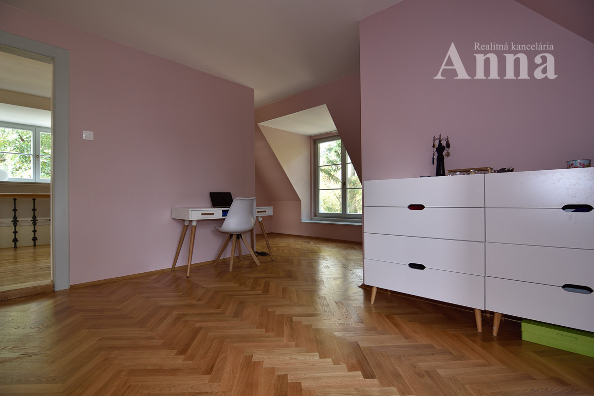 Poschodie - 3x samostatná izba, šatník, veľká kúpeľňa (voľne stojaca vaňa, 2x umývadlo, WC, sprchovací kút), chodba a sauna.