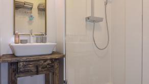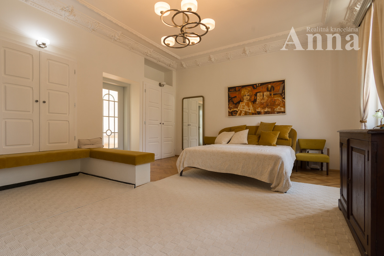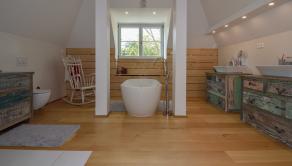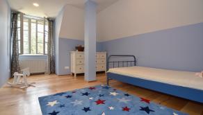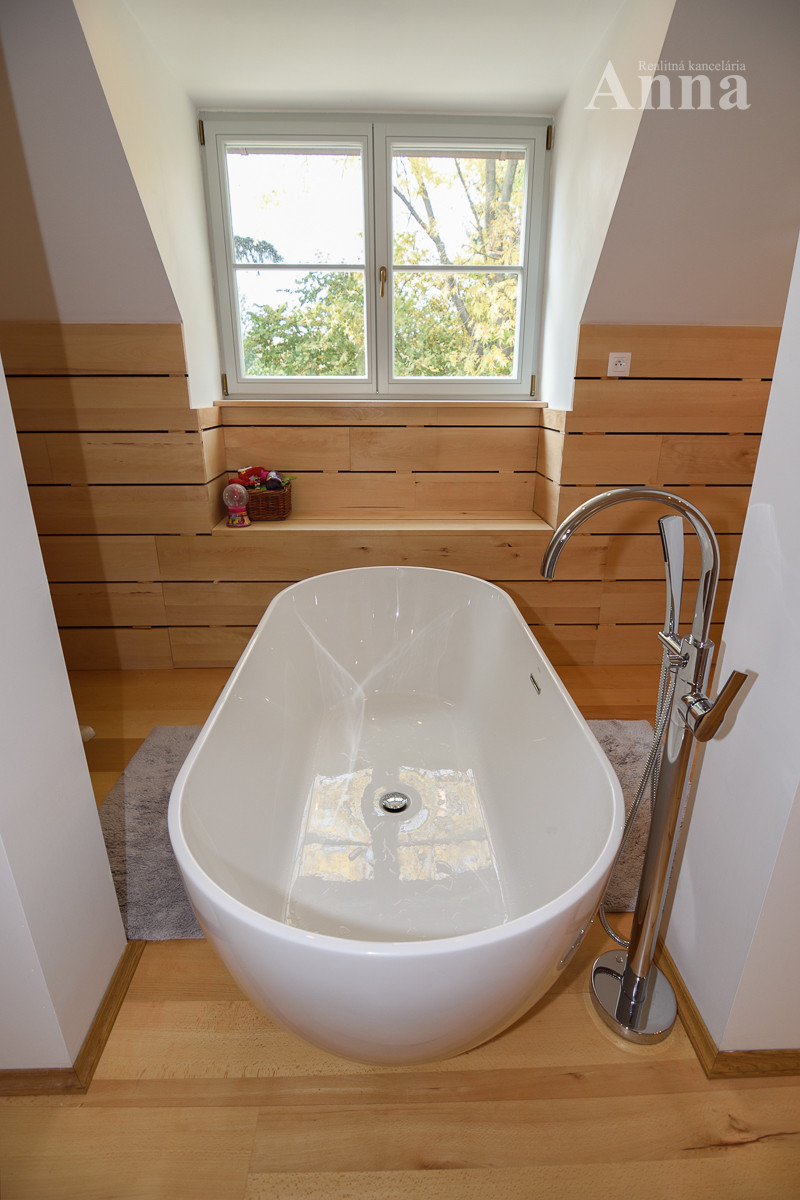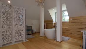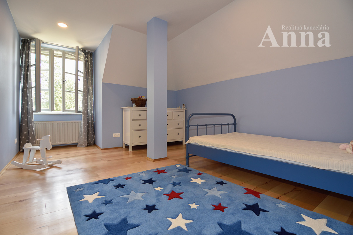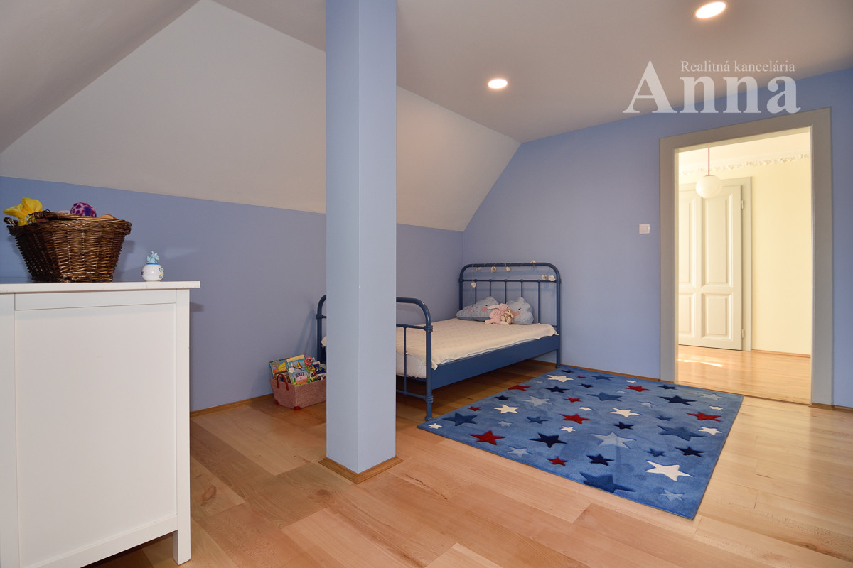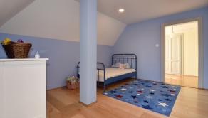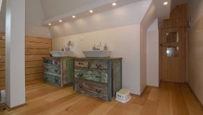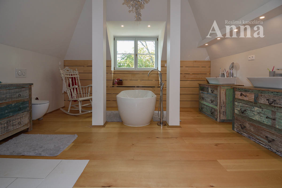 Poschodie - 3x samostatná izba, šatník, veľká kúpeľňa (voľne stojaca vaňa, 2x umývadlo, WC, sprchovací kút), chodba a sauna.