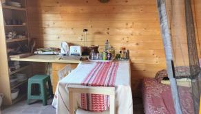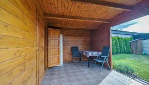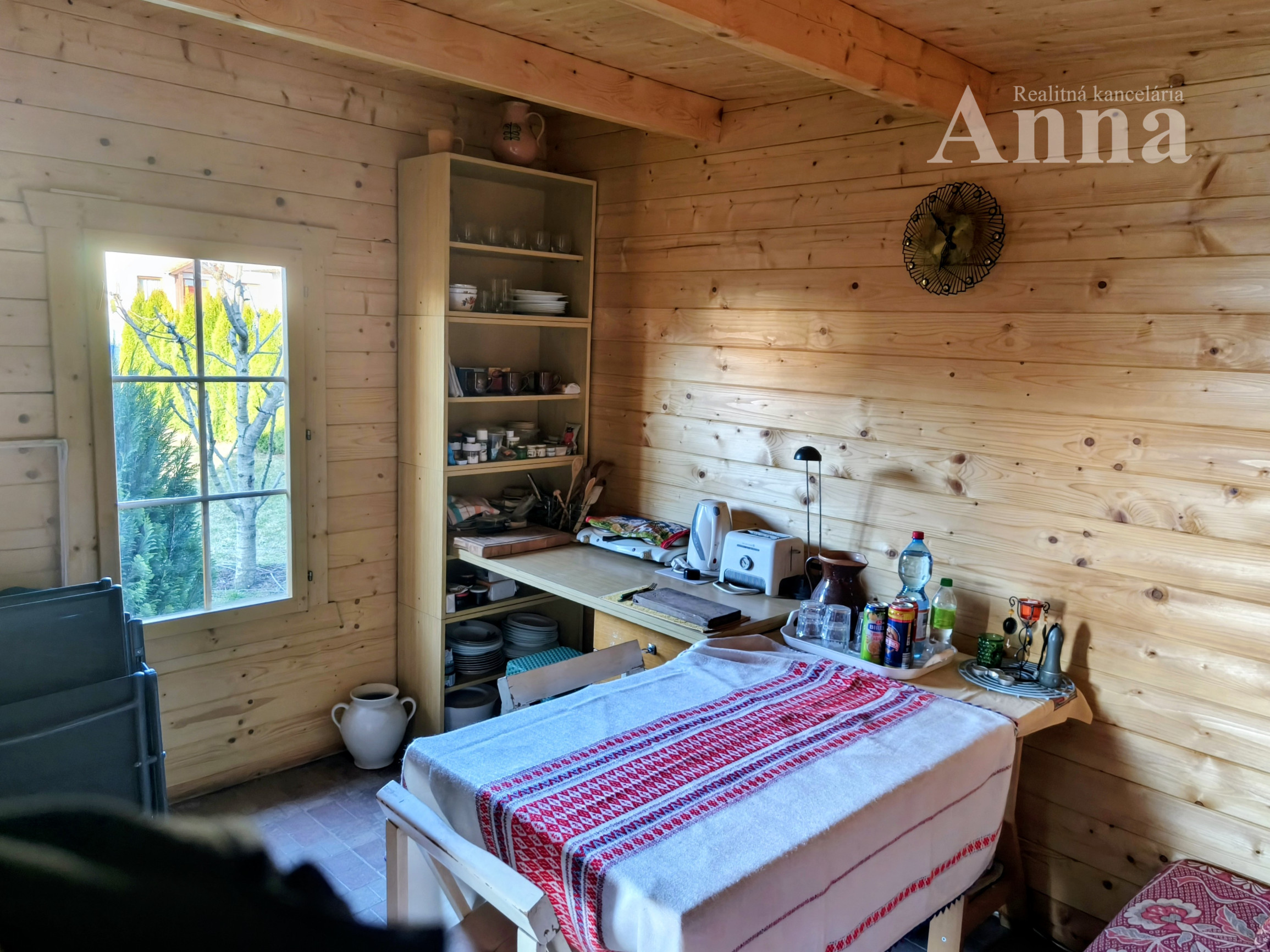 - Zariadená drevená chatka (6 x 4 m): Má jednu zariadenú obytnú miestnosť (12 m2) a väčšiu zastrešenú terasu (12m2) opatrenú s keramikou podlahou. Poslúži ako víkendový relax alebo ako komfortné zázemie pre stavebníkov (počas výstavby RD).